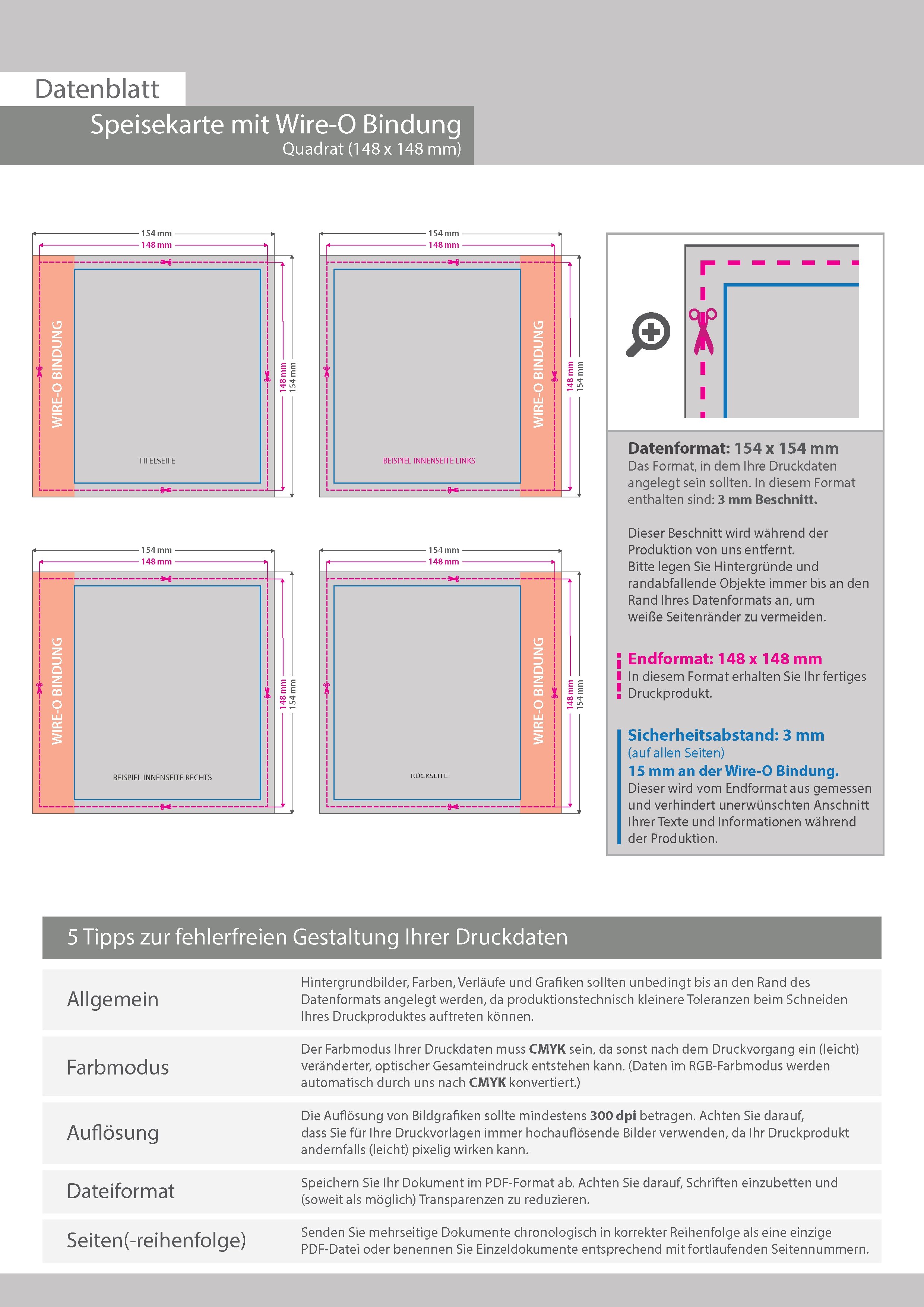 Speisekarte mit Metall-Spiralbindung, Endformat Quadrat 14,8 cm x 14,8 cm, 12-seitig